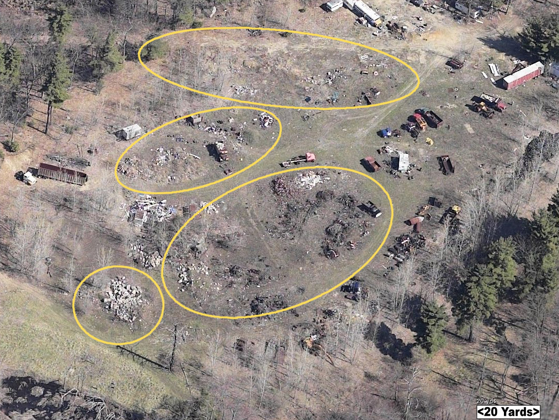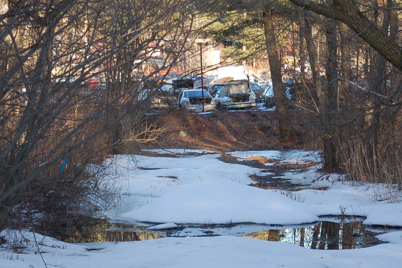 Photo taken Mar 10, 2008 taken from Pipeline marker in direction of Jack's Auto parts, showing earth fill and junk autos on top of gas pipeline right of way. This area is also marked as wetlands on survey map. | |