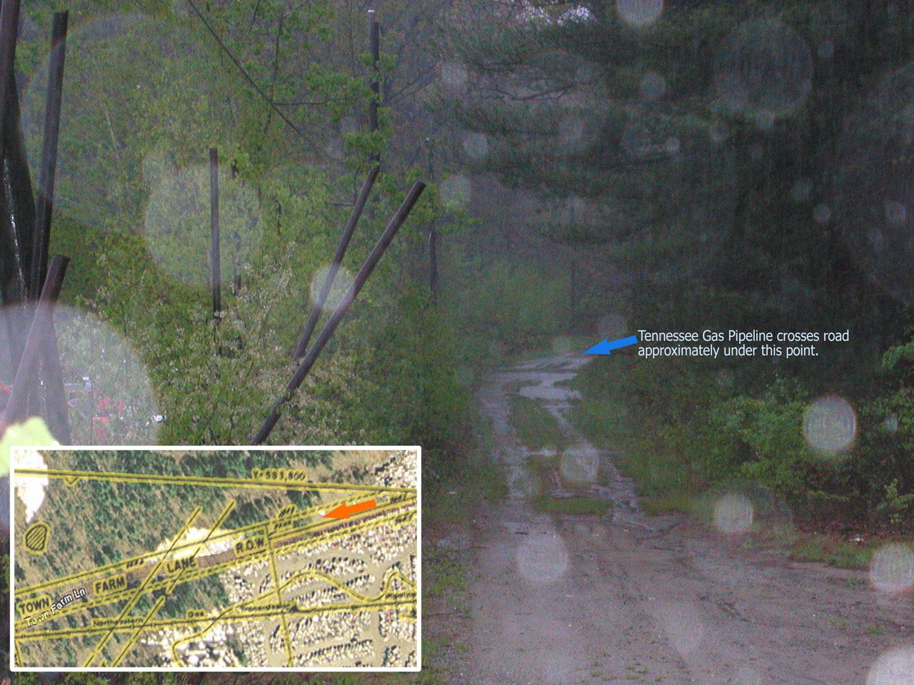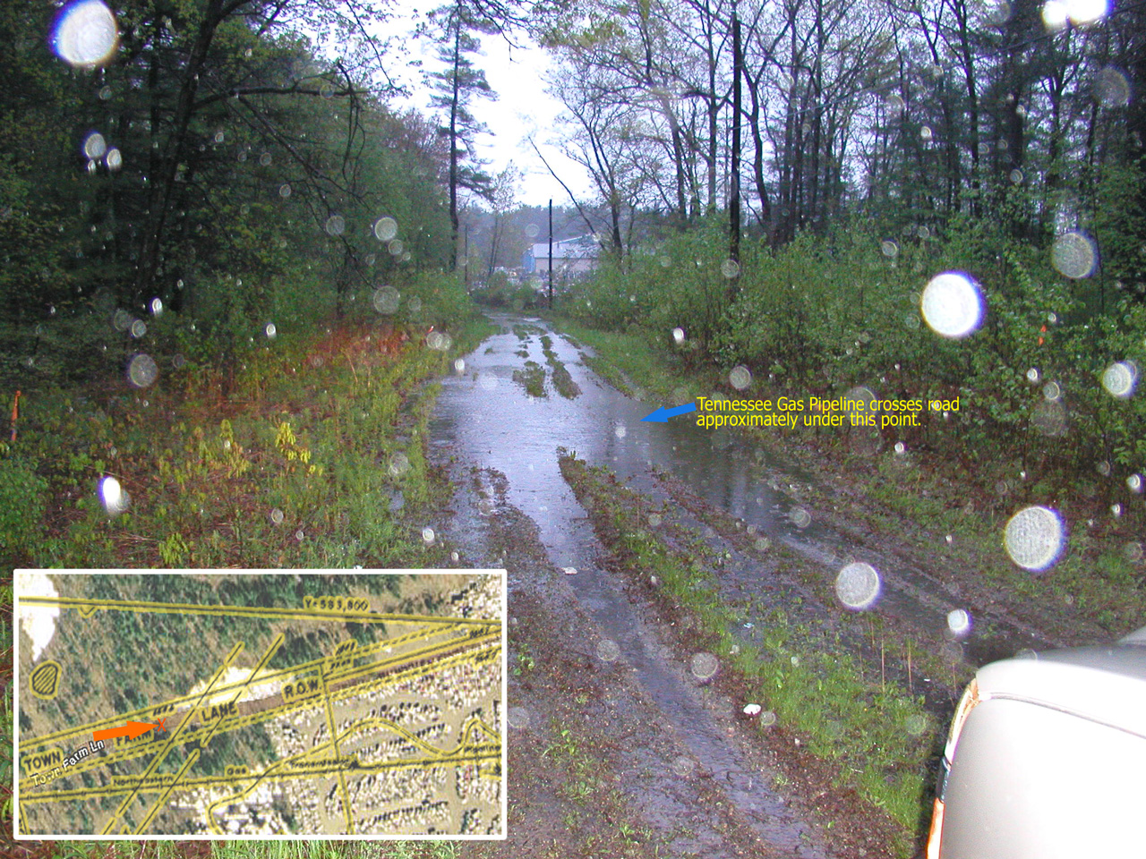 insert. This also shows: • location of Tennessee Gas pipeline (blue arrow) crossing under road • water from Concord river flooding on road over pipeline. |