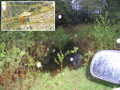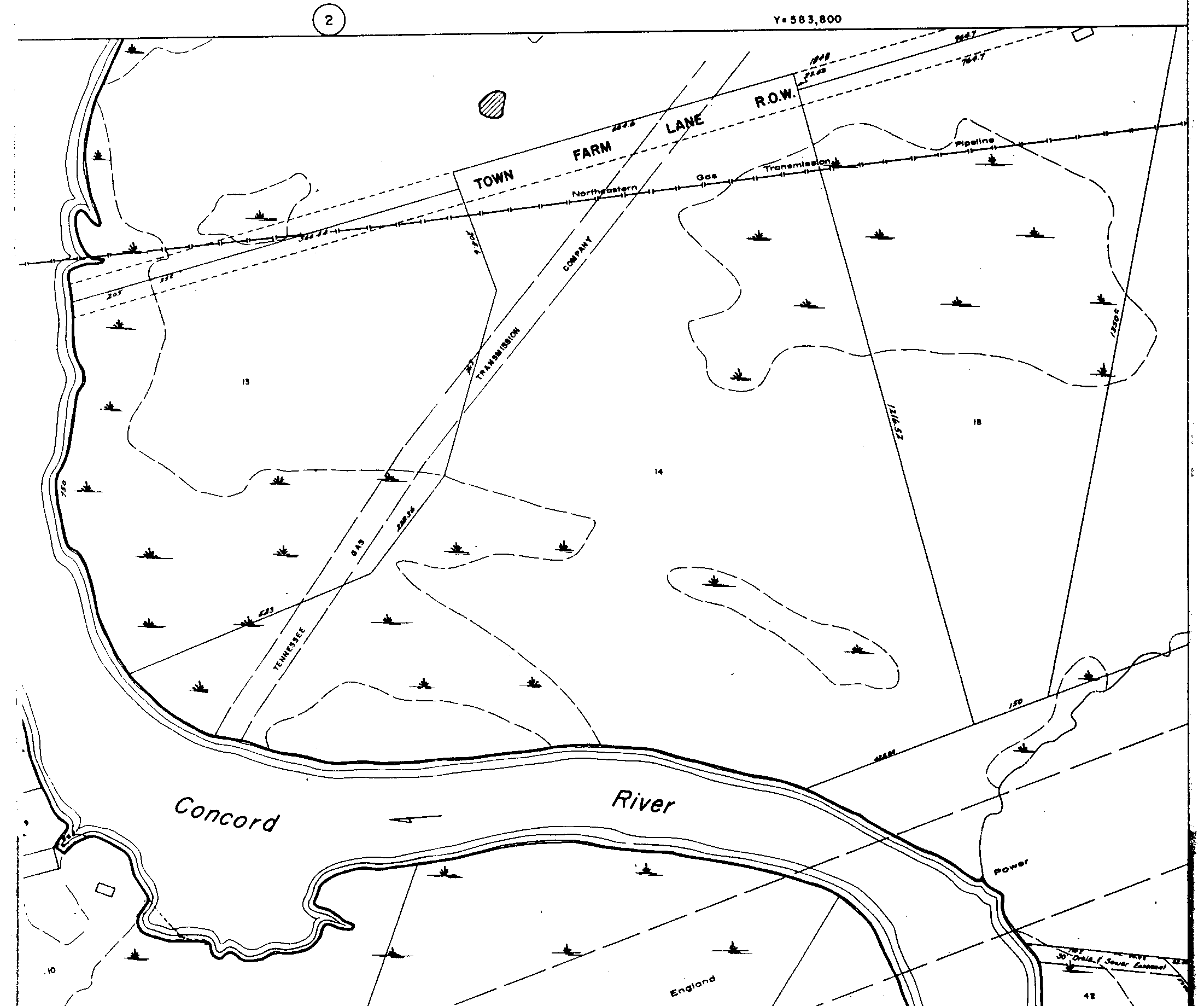 looking West toward parcel 14 as shown by red arrow on insert. This shows: • location of Tennessee Gas pipeline (blue arrow) crossing under road • water from Concord river flooding on road over pipeline. |