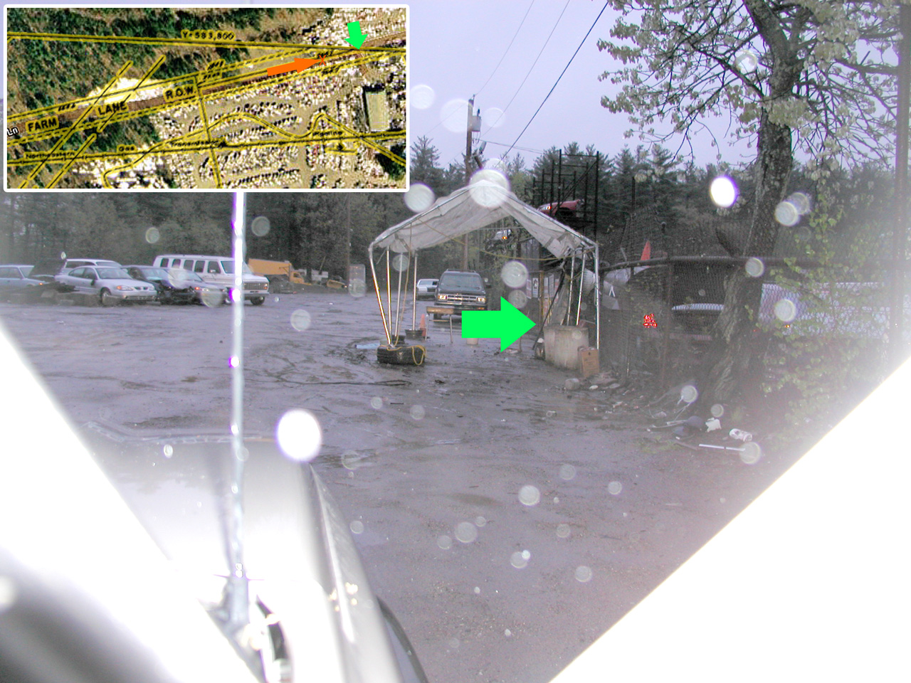 This shows: • Obstruction erected on roadway. Fenced-in area on right occupies additional 30 ft of right-of-way. Note also gasoline tank (truck body) to right of green arrow. • Additional vehicles parked on left are located on neighboring property. |